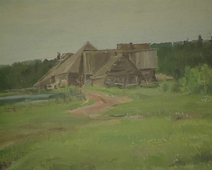«Некоторые художники решают тему мельницы через пейзаж, окружение. Вот можно посмотреть работу Алексея Исупова, молодого художника, мы видим панорамный вид. Он выбирает интересный ракурс: здесь не только мельничная постройка, но и все вокруг охватывает. Поневоле вглядываешься вдаль и можно рассматривать местность».