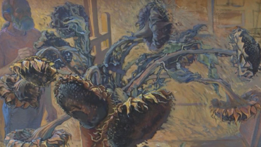 Название выставки и её центральная работа - носят одно имя "Диалог". В центре этой картины знаменитые подсолнухи Ван Гога, в нижнем правом углу - великий художник, в верхнем левом углу - автопортрет Вяткина. Рядом с Подсолнухами - ключ. Это ключ к новому творчеству. Сторонник классической живописи в последнее время стал тяготеть к новым краскам и оттенкам.