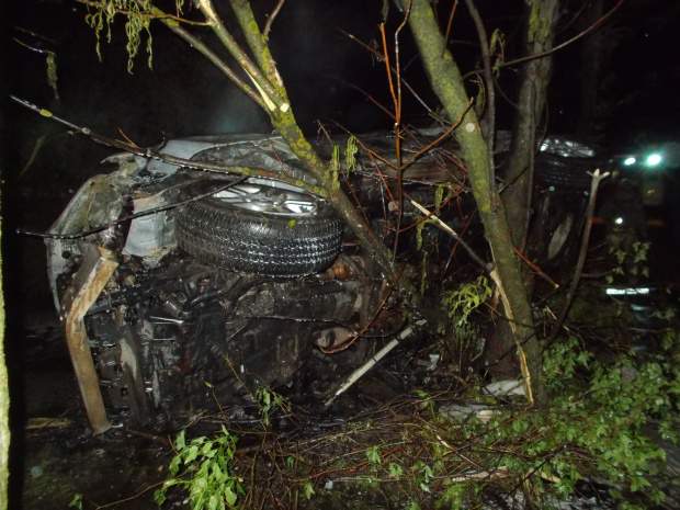 Водитель «Тойоты Ленд Крузер» не справился с управлением и съехал в кювет. В результе удара о деревья автомобиль загорелся. На место происшествия быстро подоспели пожарные и спасатели. Они сумели вызволить из салона иномарки водителя и его пассажира до того, как огонь распространился на большую часть автомобиля.
