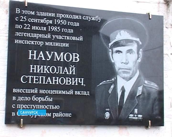 Мемориальную доску открыли на здании Санчурского отделения полиции. Именно в этих стенах с первых до последних дней служил Николай Наумов. Он родился в Санчурском районе, закончил школу и был призван в Красную Армию. Воевал на Ленинградском и первом Украинском фронтах. После демобилизации вернулся на малую Родину. Поступил на службу в милицию. Все годы Николай Степанович проработал участковым.