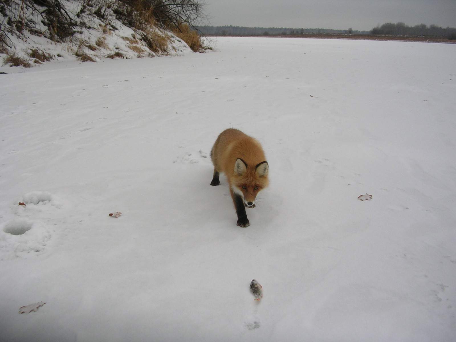 Вероятно, очень любит его и лиса. Скромная и в меру пугливая, она вызывает симпатии у людей. А они оставляют лисице мелких рыбешек от своего улова. Остается только обойти лунки не только после ухода рыбаков, но и в их присутствии. Иногда возникает необходимость постоять за свои права на «рыболовный участок». Временами туда наведывается живущий по соседству лис.