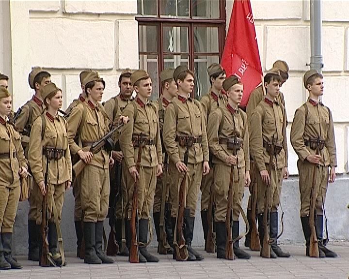 Пожалуй, главное событие дня - возложение цветов к вечному огню. Это еще и точка отсчета для "марша памяти". Командир и молодежь в формах красноармейцев готовятся пройти по улицам.