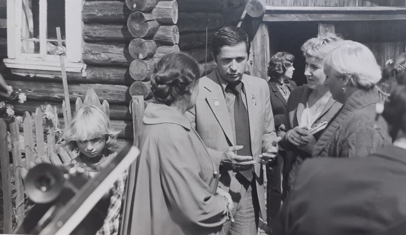 1981 г. Встреча В.П. Савиных в родной деревнеЭта сцена снималась сразу с двух камер. На фотографии, которую мы публикуем впервые, видна та трогательная атмосфера встречи дорогих друг другу людей. Простые вятские крестьяне хлебом и молоком встречают своего сына и внука, вернувшегося из, казалось бы, недостижимых далей космического пространства.