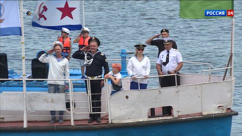 На нижней набережной Грина собрались люди разных поколений. Несколько сотен моряков, многие пришли в тельняшках и со знаменами.