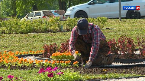 В Кирове проходят работы по озеленению города. На парадной территории у перекрестка Карла Маркса и Преображенской, высаживают однолетние бархатцы и петуньи.