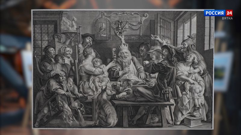 Пауль ПОНТИУС (1593-1678). «Король пьёт» (Бобовый король). С живописного произведения Якобса Йорданса. Пир в разгаре. По возгласу: «Король пьёт»! - все осушают бокалы. Пьют и старики, и дети, забыты условности и приличия, царит буйное веселье. Художник передаёт эту грубую сцену, ничего не