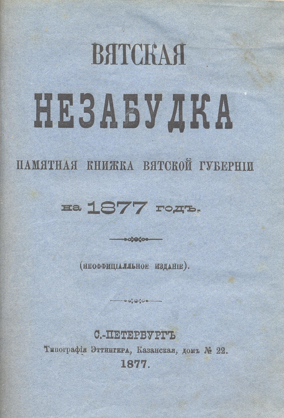 В Кировской областной научной библиотеке имени Александра Герцена, в краеведческом отделе, есть очень редкая книга второй половины 19 века «Вятская незабудка: Памятная книжка Вятской губернии на 1877 год», издание Флорентия Павленкова.