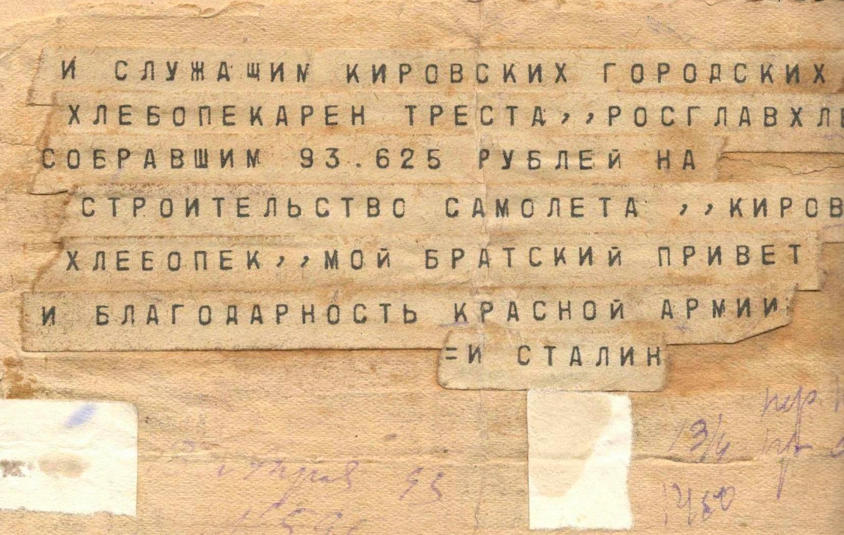 Поводом для столь высокого знака внимания со стороны Верховного Главнокомандующего Вооружёнными силами СССР стал собранный работниками хлебопекарен денежный сбор в сумме 93 625 рублей на строительство самолёта, получившего при отправке на фронт имя «Кировский хлебопёк». Телеграмма свидетельствует о таком характерном явлении советской эпохи, как добровольные пожертвования населения на государственные нужды.В годы Великой Отечественной войны особое распространение получили сборы средств, как денежных, так и вещевых, для нужд фронта. Так и рабочие, и служащие кировских хлебопекарен не остались в стороне от этого благородного дела, за что были отмечены особой благодарностью от лица руководства СССР. Интересно было бы узнать: на каком фронте, и в каких сражениях громил врага боевой самолет «Кировский хлебопёк»!
