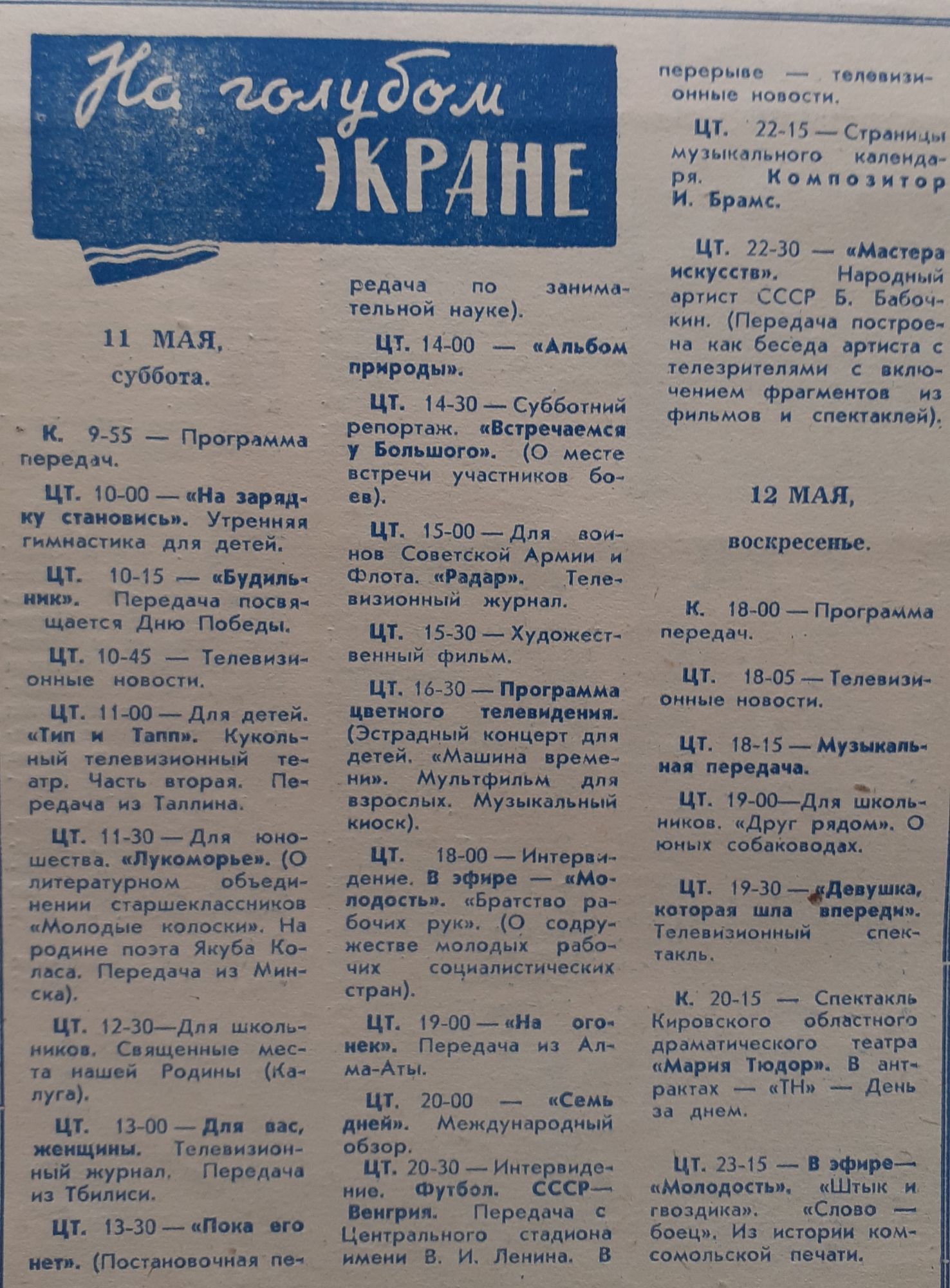 Давайте заглянем в телевизионную программу 1967 года и узнаем, какие телепередачи Центрального телевидения пришли в дома кировчан. Конечно же, все смотрели информационную программу «Время», первый выпуск которой вышел в эфир 1 января 1968 года. До этого были «Телевизионные новости» с небольшим хронометражем и еженедельное обозрение «Эстафета новостей». Появилась возможность смотреть такие популярные программы, как «Клуб кинопутешественников». Весной 1968 года появилась программа «В мире животных». Обязательно смотрели предновогодний «Голубой огонек». Дети слушали перед сном сказки и смотрели мультфильмы в программе «Спокойной ночи, малыши». А по субботам просыпались вместе с позывными детской передачи «Будильник». Эти программы стали поистине любимыми для многих поколений советских людей. А в программе передач Кировской студии телевидения появились крупные буквы ЦТ, обозначающие вещание программ Центрального телевидения!