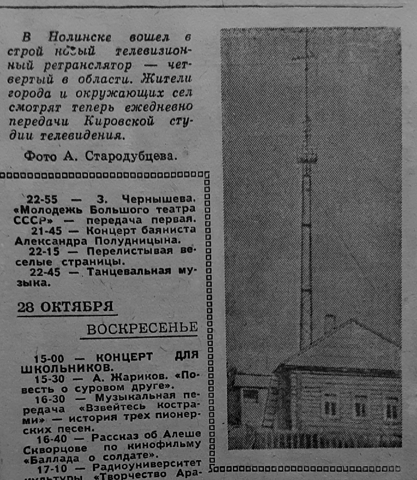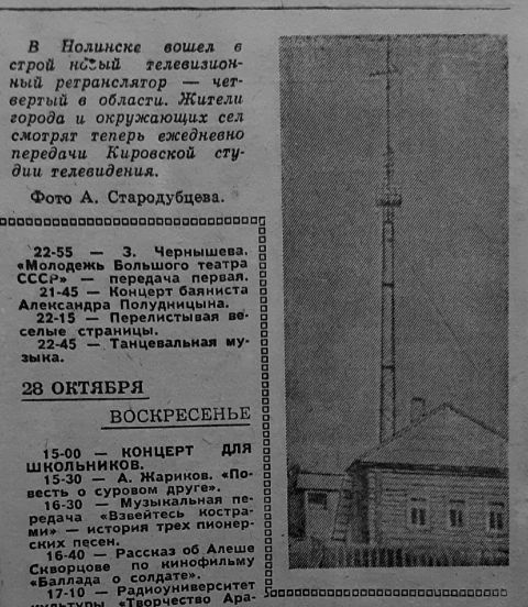 В ноябре 1967 года Центральное телевидение пришло в Киров по временной радиорелейной линии. Кировчане впервые увидели прямой эфир из Москвы. 4 ноября они стали свидетелями торжественного заседания, посвященного 50-летию Октября. А 7 ноября 1967 года впервые увидели (а некоторые даже в цвете!) трансляцию военного парада и демонстрации трудящихся на Красной площади!