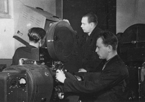Юрий Федорович Веретенников у кинопроекционного аппарата 1958 г