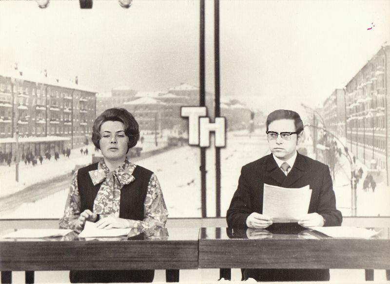 Телевизионная служба новостей 1970-е. Дикторы Елена Услова и Александр ВорожцовА еще одно время практиковалось ведение новостей на два голоса. Тексты заучивали чуть ли не наизусть, тогда не было никаких теле-суфлеров, а беспрерывно смотреть в текст, отнюдь не приветствовалось. Пока партнер, Елена Александровна Услова читает свою информацию, я еще раз вникаю в суть своего текста, время от времени, заглядывая на страничку Лены, чтобы вовремя подхватить ее. Не должно быть никаких заминок. Правда, иногда они случались, когда пленка с сюжетом по каким-либо причинам задерживалась и кому-то из нас приходилось прикрывать паузу собой в кадре.