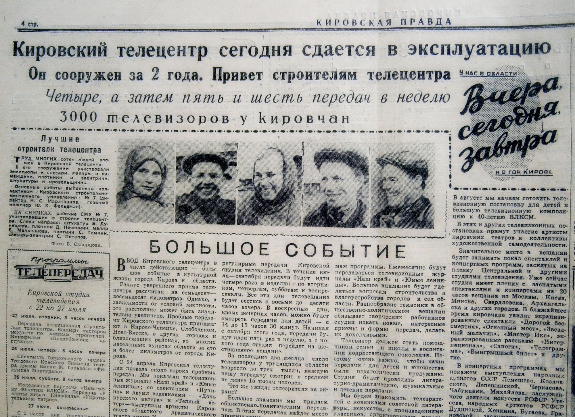 Страница Кировской правды, сообщающая об открытии телецентра 22 июля 1958 г.