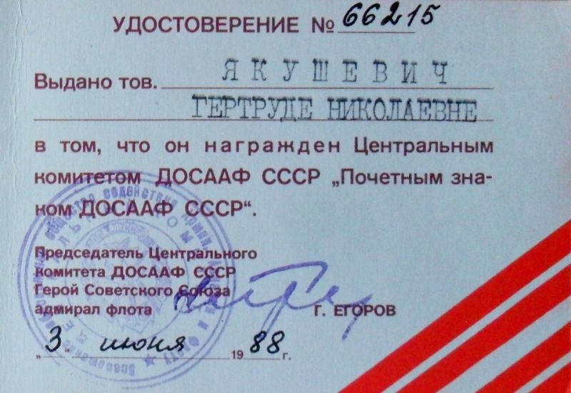 За многолетнюю верную службу Родине, я была награждена Центральным комитетом ДОСААФ СССР «Почетным знаком ДОСААФ СССР», где стоит подпись Председателя Центрального комитета ДОСААФ СССР, Героя Советского Союза адмирала флота Егорова. Я горжусь этой наградой!