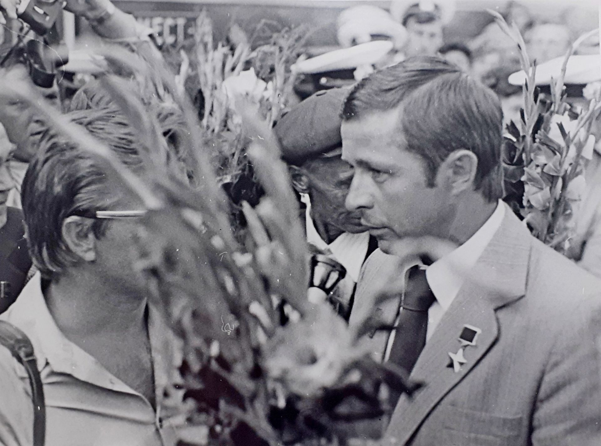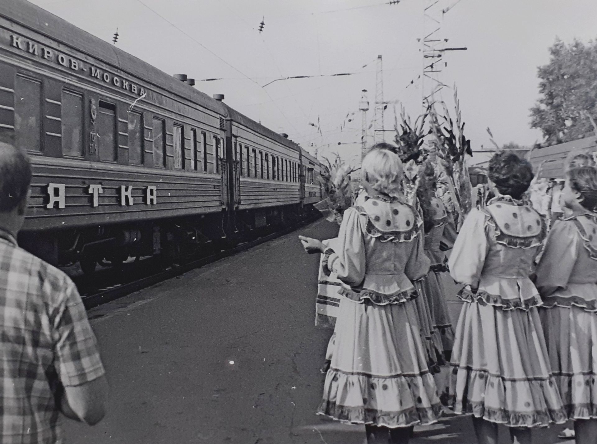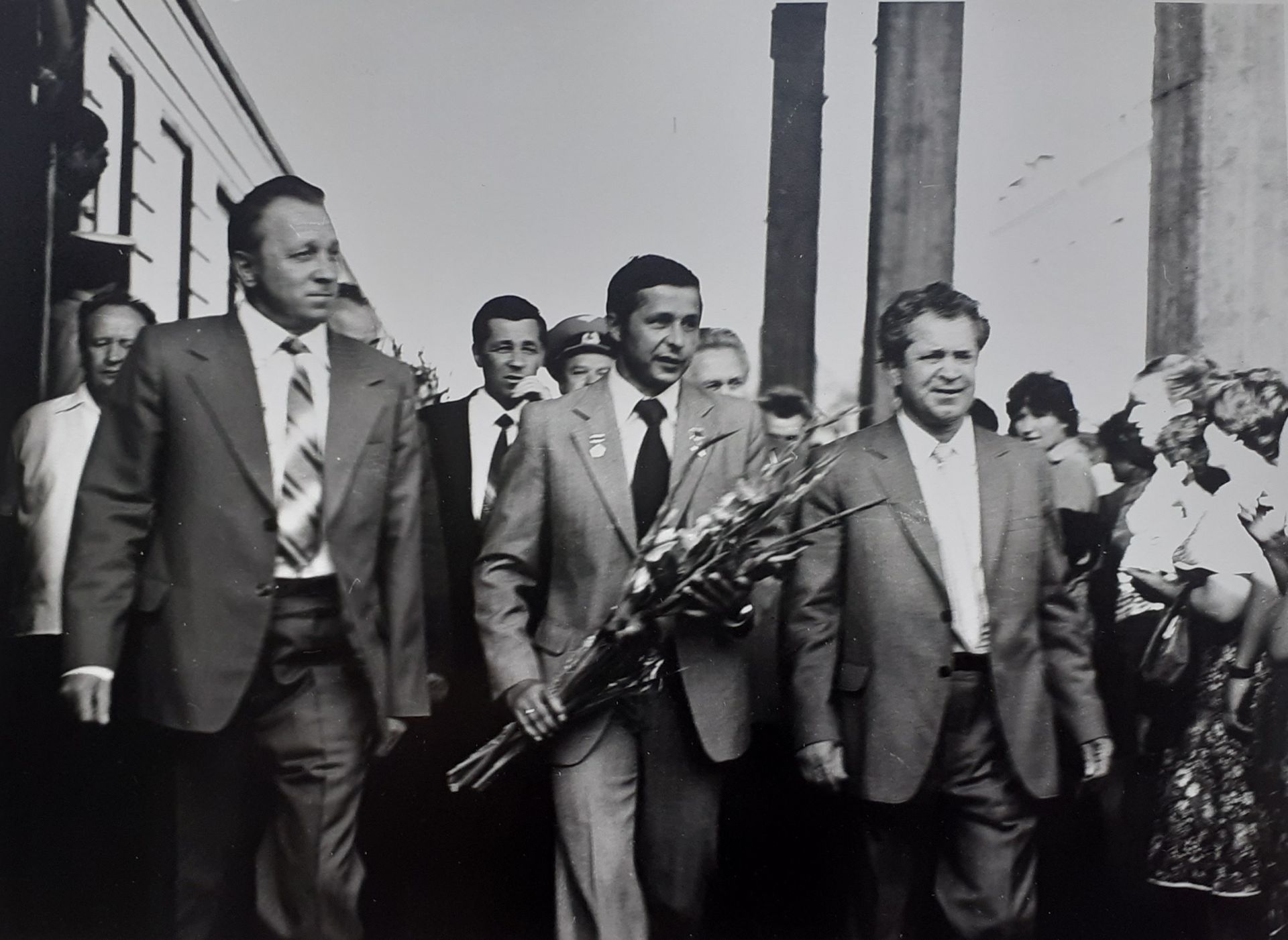 Встреча В.П Савиных в Кирове на вокзалеНа этом снимке штатного фотографа кировского телевидения Николая Загоскина встреча земляка-космонавта на вокзале в городе Кирове в 1981 году после первого полета в космос. Рядом с Виктором Савиных по перрону идут первые лица области. 1-й секретарь обкома Иван Петрович Беспалов (справа), председатель облисполкома Юрий Иванович Деревской.
