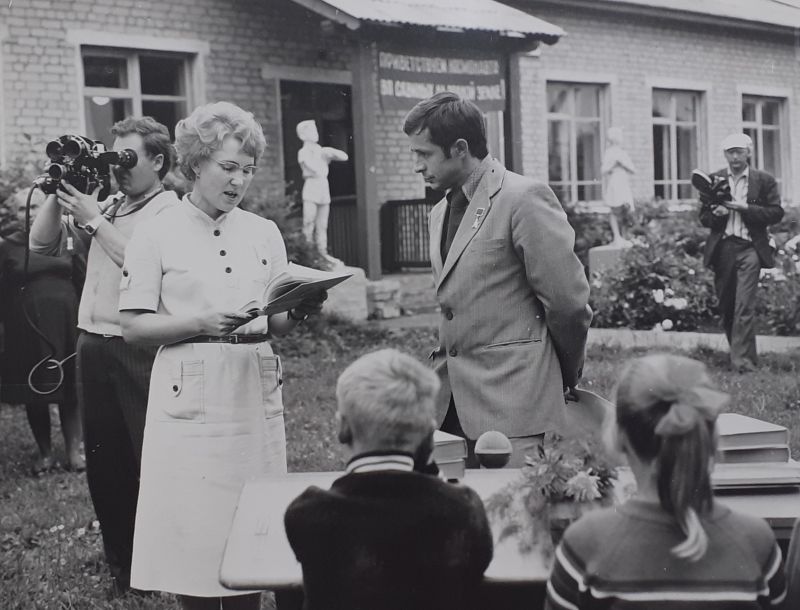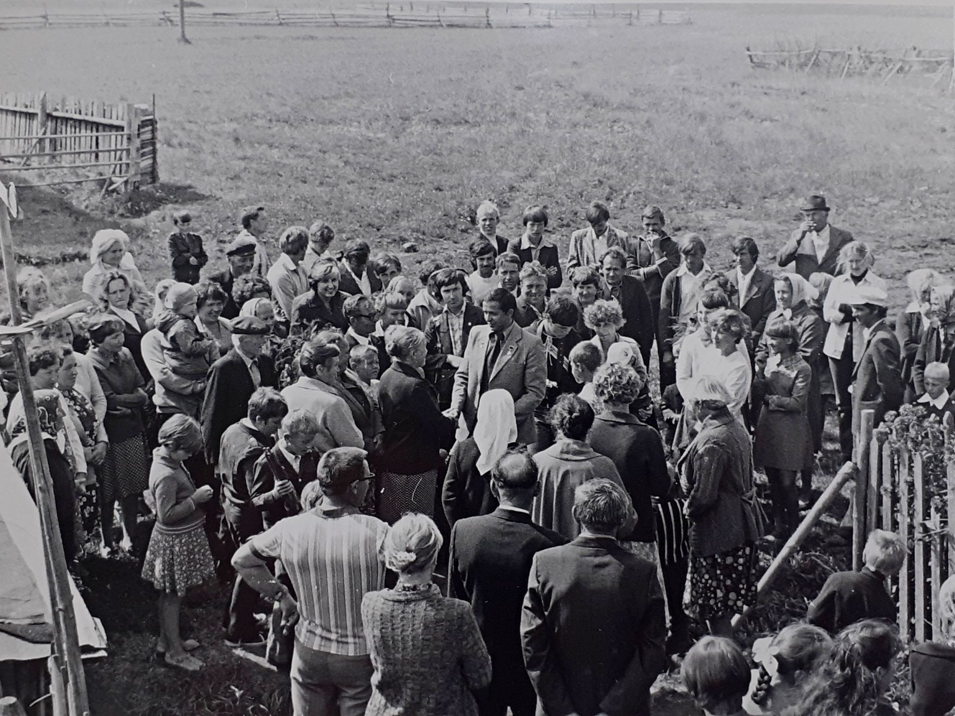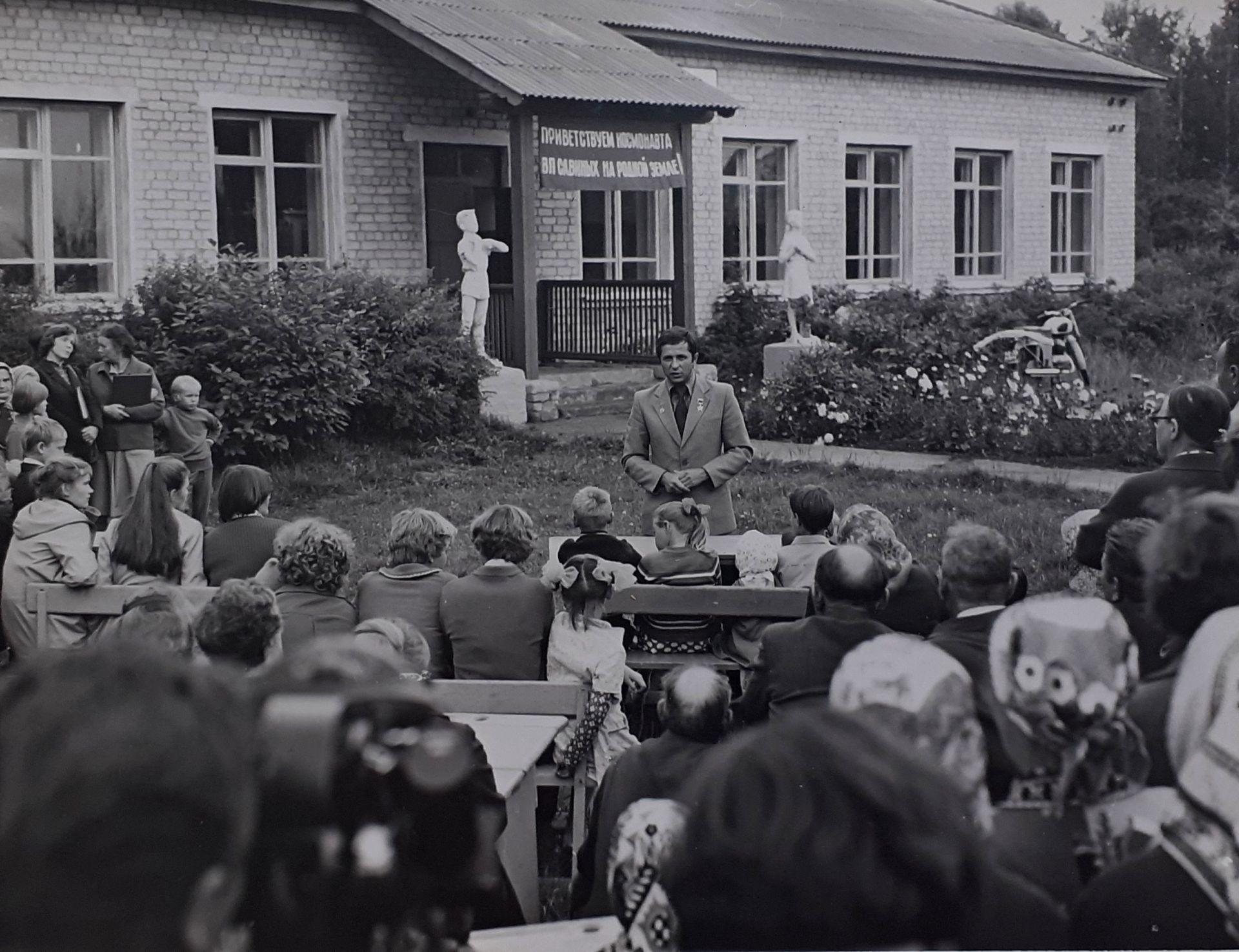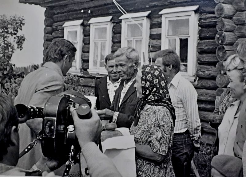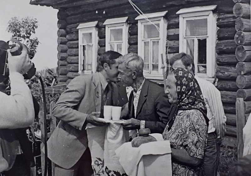1981 г. Встреча В.П. Савиных в родной деревнеЭта сцена снималась сразу с двух камер. На фотографии, которую мы публикуем впервые, видна та трогательная атмосфера встречи дорогих друг другу людей. Простые вятские крестьяне хлебом и молоком встречают своего сына и внука, вернувшегося из, казалось бы, недостижимых далей космического пространства.