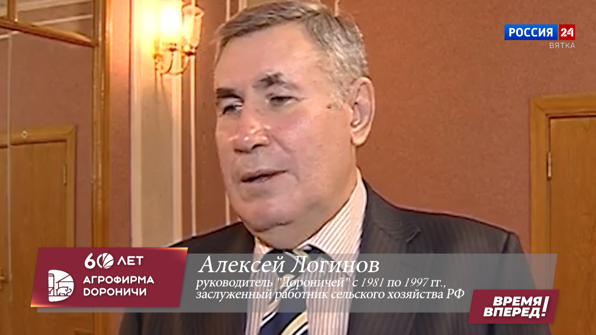 Выпуск программы ««Время, вперед!». Агрофирме «Дороничи» - 60 лет» посвящен Алексею Логинову, директору «Дороничей» с 1981 по 1997 годы. Совхоз под его руководством в 80-е годы переживает эпоху расцвета. «Дороничи» быстро становятся образцовым для всей области хозяйством. Вводится в строй крупнейший в то время свиноводческий комплекс. Удается увеличить поголовье свиней до 36 тысяч голов. Застраиваются новыми домами целые улицы, молодые специалисты получают квартиры, параллельно асфальтируются дороги и дворы, строится Дворец культуры, музыкальная школа, Дом быта, пруд с дамбой, детский сад с бассейном, амбулатория, и многое другое. Вклад Алексея Логинова в развитие агрофирмы "Дороничи" и сельского хозяйства всей Кировской области трудно переоценить.
