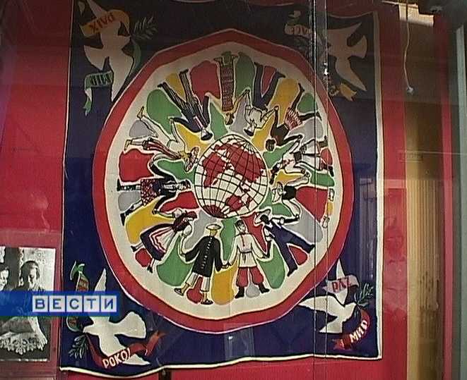 А этот платок - свидетель того, как впервые был приподнят "железный занавес". Его подарили участнице фестиваля молодежи и студентов 57-го года. Когда в Россию приехали тысячи молодых людей со всего мира.