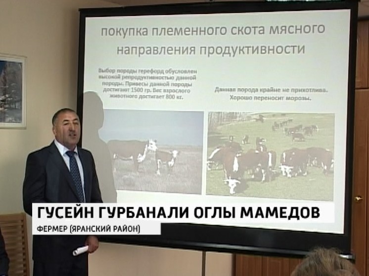 Гусейн Мамедов, глава фермерского хозяйства из Яранского района представил проект по выращиванию крупного рогатого скота мясных пород.