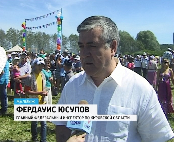 Сабантуй- 2013ФЕРДАУИС ЮСУПОВ, ГЛАВНЫЙ ФЕДЕРАЛЬНЫЙ ИНСПЕКТОР ПО КИРОВСКОЙ ОБЛАСТИ: «Именно здесь масса проживания татар, чей сегодня праздник Сабантуй. И думаю, что я доложу Правительству о том, чтобы рассмотреть вопрос, чтобы массовый в Кировской области Сабантуй был именно в Малмыже. И очень хотелось, чтобы была возможность создания здесь единого духовного управления - Мусульманского, Исламского. И мы просто, по-человечески, поговорили о проблемах, направлениях, о необходимости изучения в школах татарского языка».