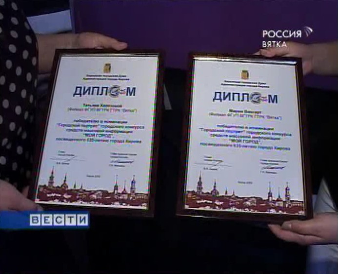 В первом городском конкурсе средств массовой информации "Мой город" участвовало более трёхсот журналистов - представители телекомпаний, радиостанций, газет, электронных изданий. Конкурс был посвящён 635-летию города, поэтому и номинации носили соответствующие названия: главная городская новость, городской портрет. Как раз в этой номинации наши сотрудники журналист Мария Вингарт и режиссёр Татьяна Халезова заняли 1 место за фильм "Дважды вятич".