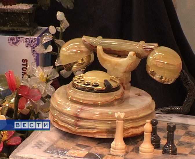 Подобное из камня мог сотворить сказочный Данила-мастер: цветы, мебель и даже телефон, кстати, рабочий. Оникс советуют взять в руки, почувствовать. А рядом - зеленый янтарь, жемчуга и самоцветы. Сувениры, бижутерия и драгоценности. Здесь говорят: "Всё на пользу".