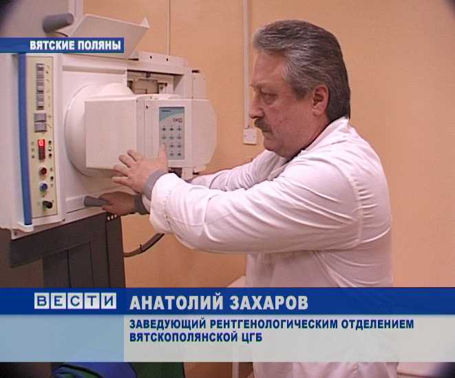 АНАТОЛИЙ ЗАХАРОВ, ЗАВЕДУЮЩИЙ РЕНТГЕНОЛОГИЧЕСКИМ ОТДЕЛЕНИЕМ ВЯТСКОПОЛЯНСКОЙ ЦГБ: «Раньше было - мы стояли за экраном здесь, сейчас тут усилитель рентгеновского изображения, который выдаёт данные уже на телевизор. То есть, это уже идёт минимальная рентгеновская нагрузка на больного».