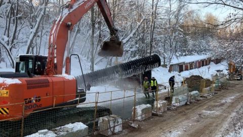Сейчас там прокладывают новую двухслойную гофрированную трубу длиной 200 метров и диаметром 800 мм. Эта технология обеспечит повышенную прочность и долгий срок службы участка коммуникаций.