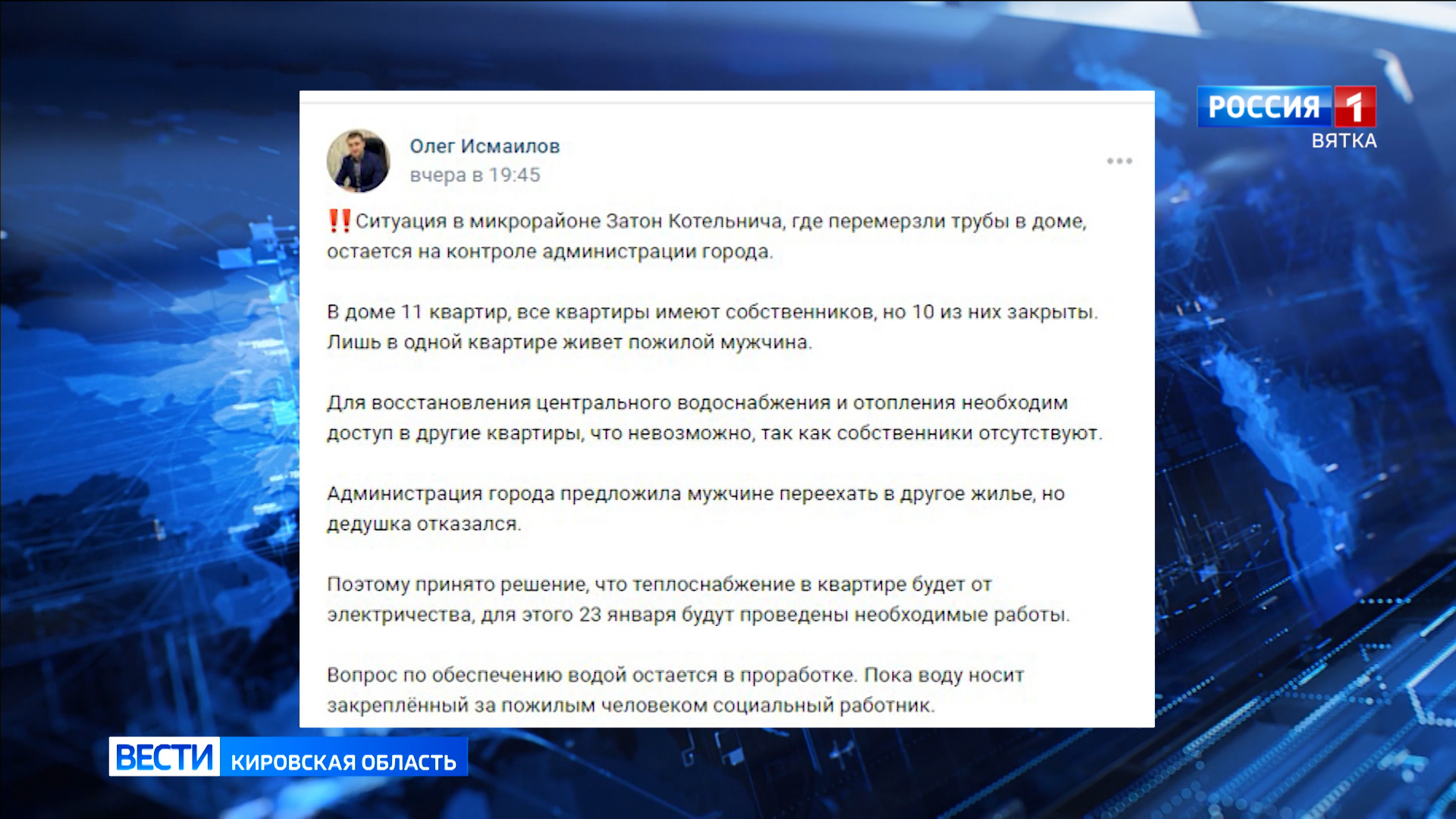 Дело в том, что в доме располагается 11 квартир, и 10 из них закрыты, для восстановления подачи ресурсов необходимо попасть в другие квартиры, что сейчас невозможно из-за отсутствия собственников. Принято решение, что отапливать помещение будут от электричества, сегодня проведут необходимые работы. Что касается обеспечения водой - вопрос пока в проработке. Воду носит социальный работник.