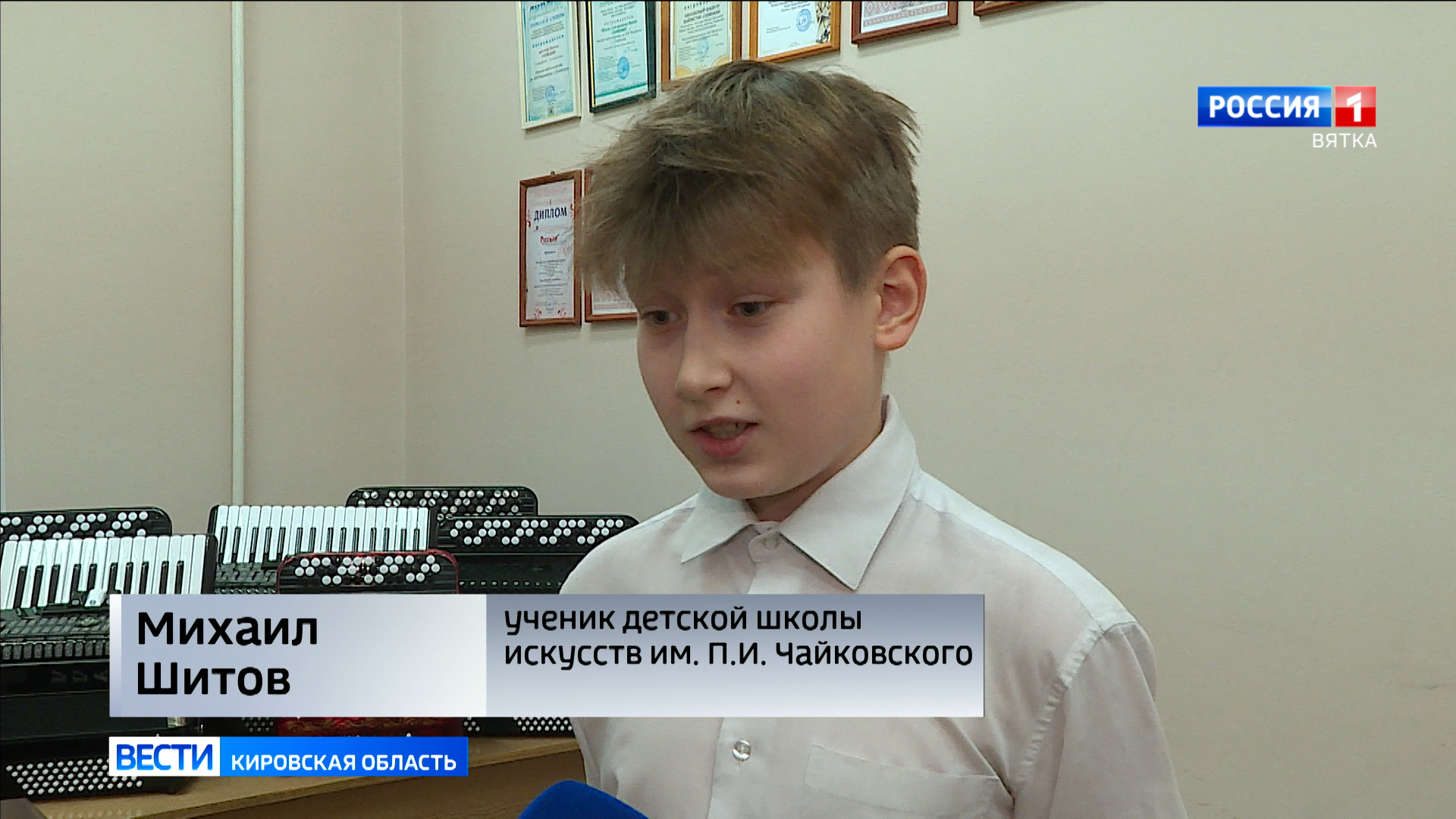 Михаил Шитов увлекается музыкой уже 7 лет. В этой школе учились игре на инструменте и его братья. Миша считает, что аккордеон звучит завораживающе и может передать любое настроение. Новые аккордеоны оказались намного удобней: басовых кнопок в них меньше, а ремни широкие и мягкие.
