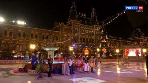 В этом году каток оформлен в стиле дымковской игрушки, как и главный универмаг страны. Красная площадь - обычно строгая и величественная - сегодня стала еще и невероятно душевной, окутавшись в яркие, жизнерадостные узоры.