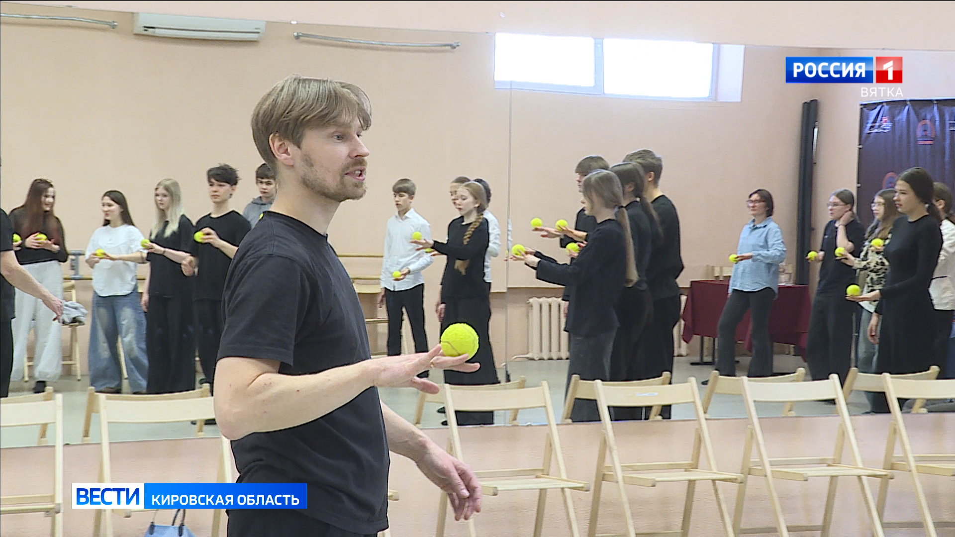 Занятие проводит преподаватель колледжа культуры. Участники изучают базовые принципы работы с предметами и осваивают технику жонглирования. Не в теории, а на практике.