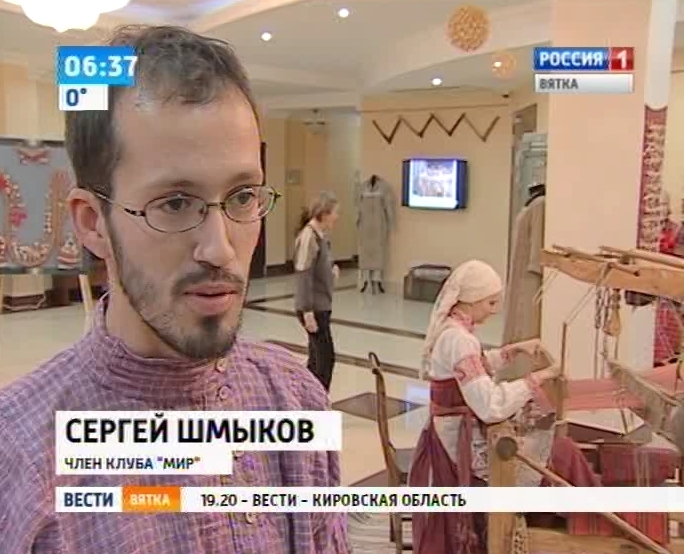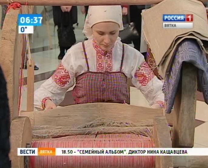 Идею для художественных инсталляций, представленных на выставке, дал вот этот старинный ткацкий станок. В старину девочки учились ткать с пятилетнего возраста. Благодаря мастерству ткачих вятчане были одеты и в будни, и в праздники. Одними из первых осваивать ткачество в наши дни стали члены историко-краеведческого клуба "Мир". И у них неплохо получается.