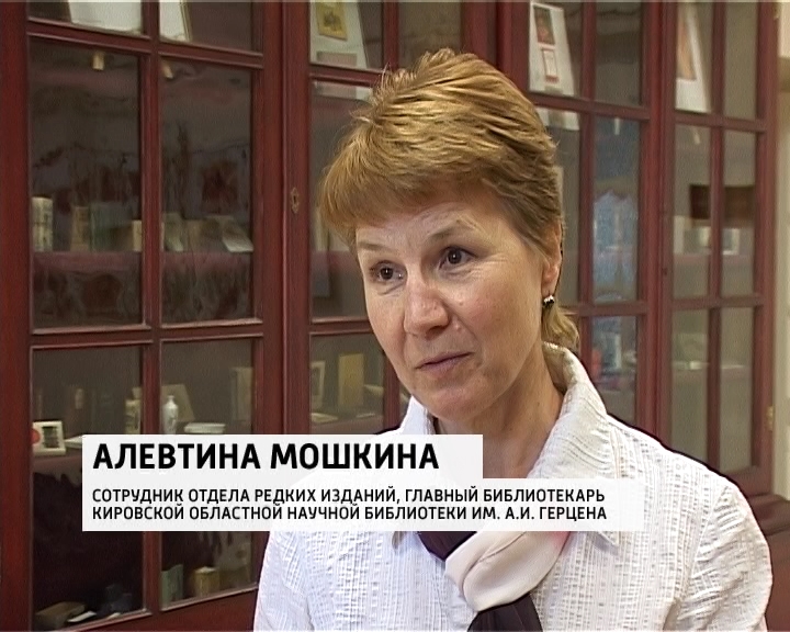 АЛЕВТИНА МОШКИНА, СОТРУДНИК ОТДЕЛА РЕДКИХ ИЗДАНИЙ, ГЛАВНЫЙ БИБЛИОТЕКАРЬ КИРОВСКОЙ ОБЛАСТНОЙ НАУЧНОЙ БИБЛИОТЕКИ ИМ. А.И. ГЕРЦЕНА: «Мы можем представить два варианта факсимильных изданий это издание 1837 года, Санкт-Петербург, есть и оригинал и факсимильная копия. Вы видите, что оно отличается даже чисто внешне».