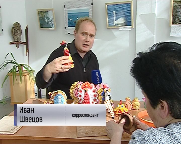 «Здесь есть самые разные игрушки, эти похожи на традиционных дымковских, у этой - форма дымковская, но покрашена она совсем по-другому, ну и эта самая интересна. По очертаниям похожа на дымковского индюка, но у нее голова женщины, в руках она держит книгу, и называется это существо волшебная птица алконост».