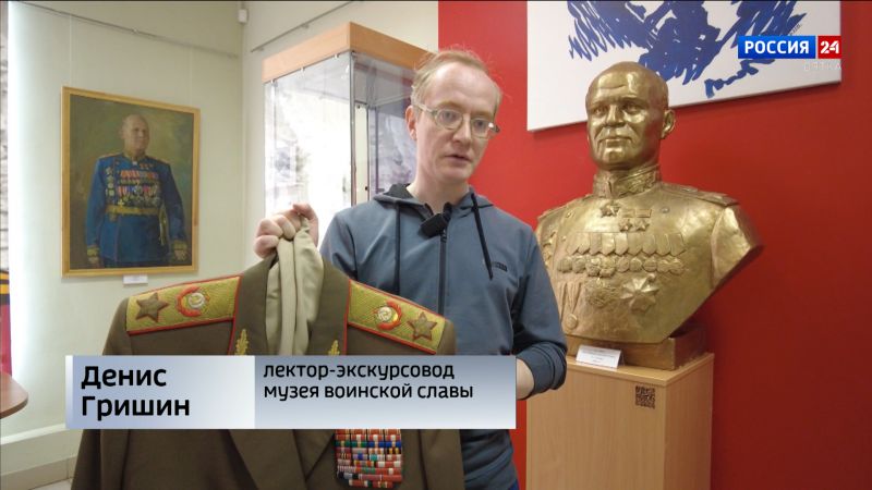 ДЕНИС ГРИШИН, ЛЕКТОР-ЭКСКУРСОВОД МУЗЕЯ ВОИНСКОЙ СЛАВЫ:«Китель, конечно, послевоенный, но, чем он ценен - тем, что здесь все награды, которых был удостоен Иван Степанович Конев. И две медали "золотая звезда", и вот в виде таких колодочек все ордена медали, которыми он был награжден».