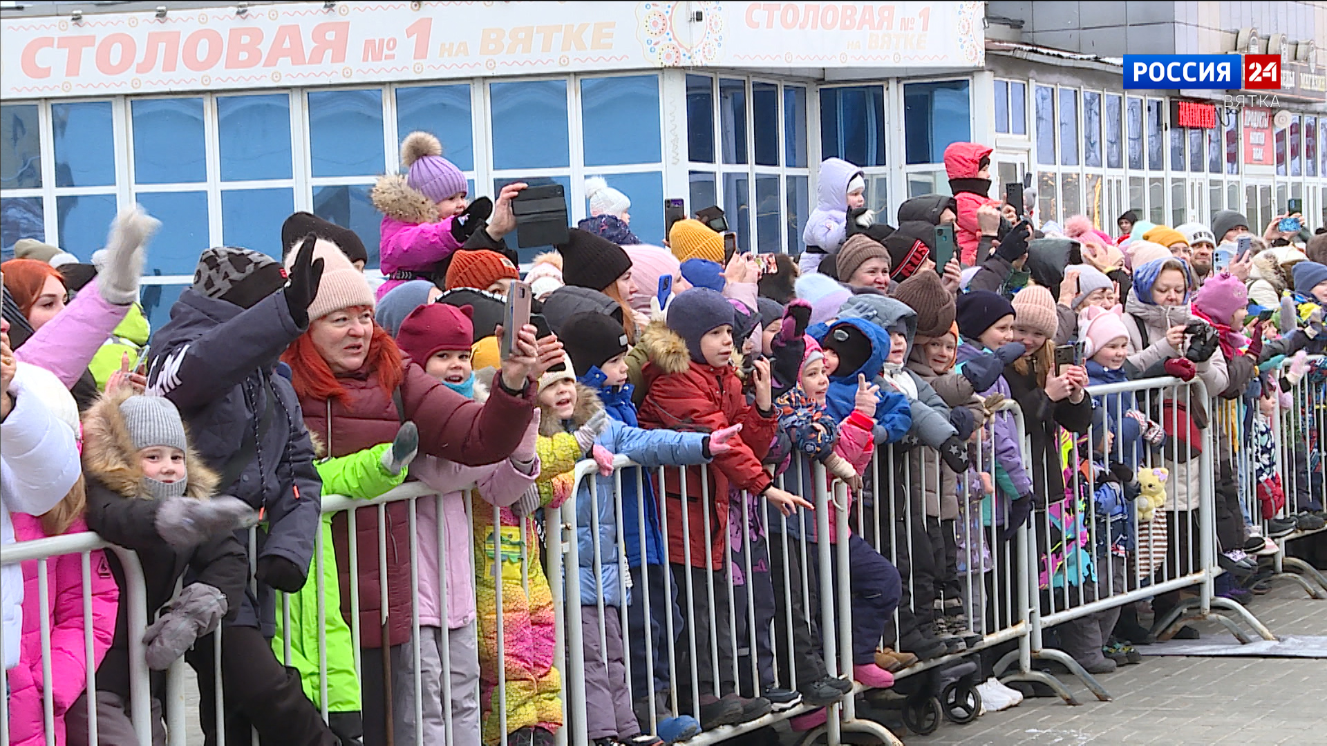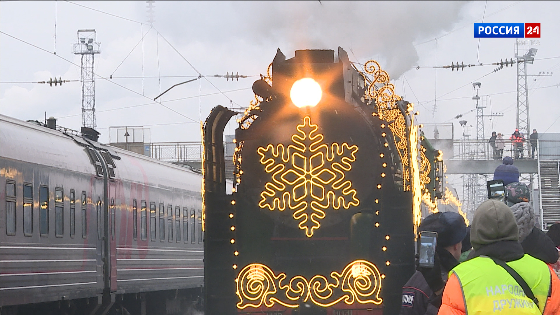 Новогодний поезд Деда Мороза остановился в Кирове. На вокзале он простоял несколько часов, в течение которых малыши увидели торжественную праздничную программу с участием артистов и аниматоров.