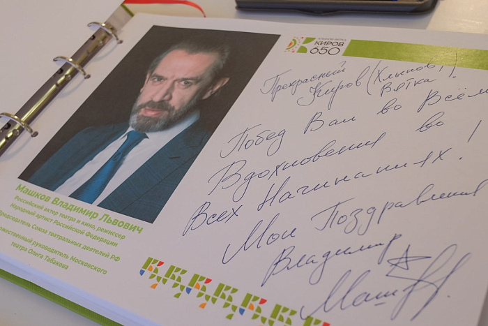 Народный артист оставил городу Кирову поздравление в книге пожеланий к 650-летию: «Прекрасный Киров (Хлынов, Вятка)! Побед вам во всем! Вдохновения во всех начинаниях! Мои поздравления!».