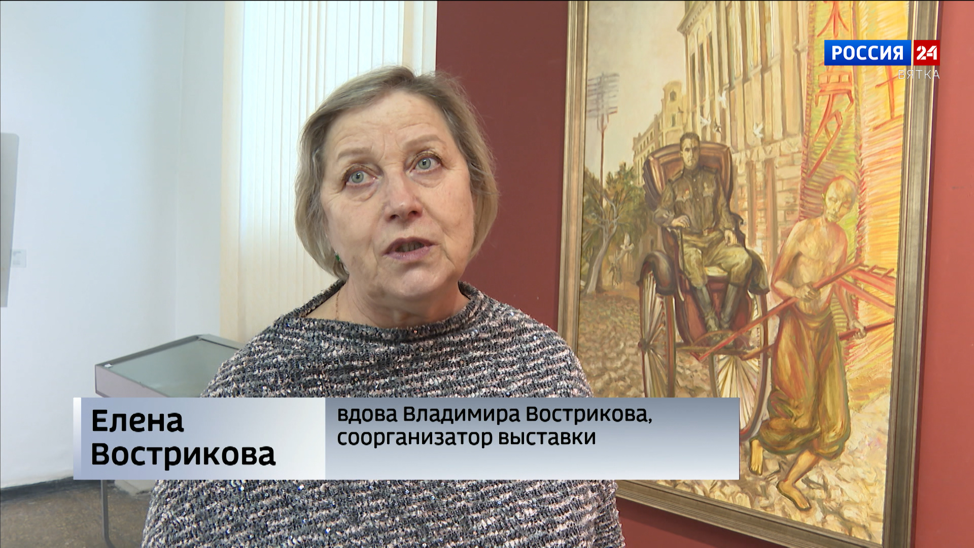 Не только красота и величие природы, но и вечные ценности. Например, любовь к Родине - обязательный компонент работ художника Владимира Вострикова. В этом полотне - личная, семейная история Владимира Ивановича. На картине изображён отец художника, участник Великой Отечественной войны. Соседняя работа передаёт преданность советских воинов друг другу. Величие народа-победителя мастер изобразил в сцене, как красноармейцы несут раненого товарища через заросли иван-чая.