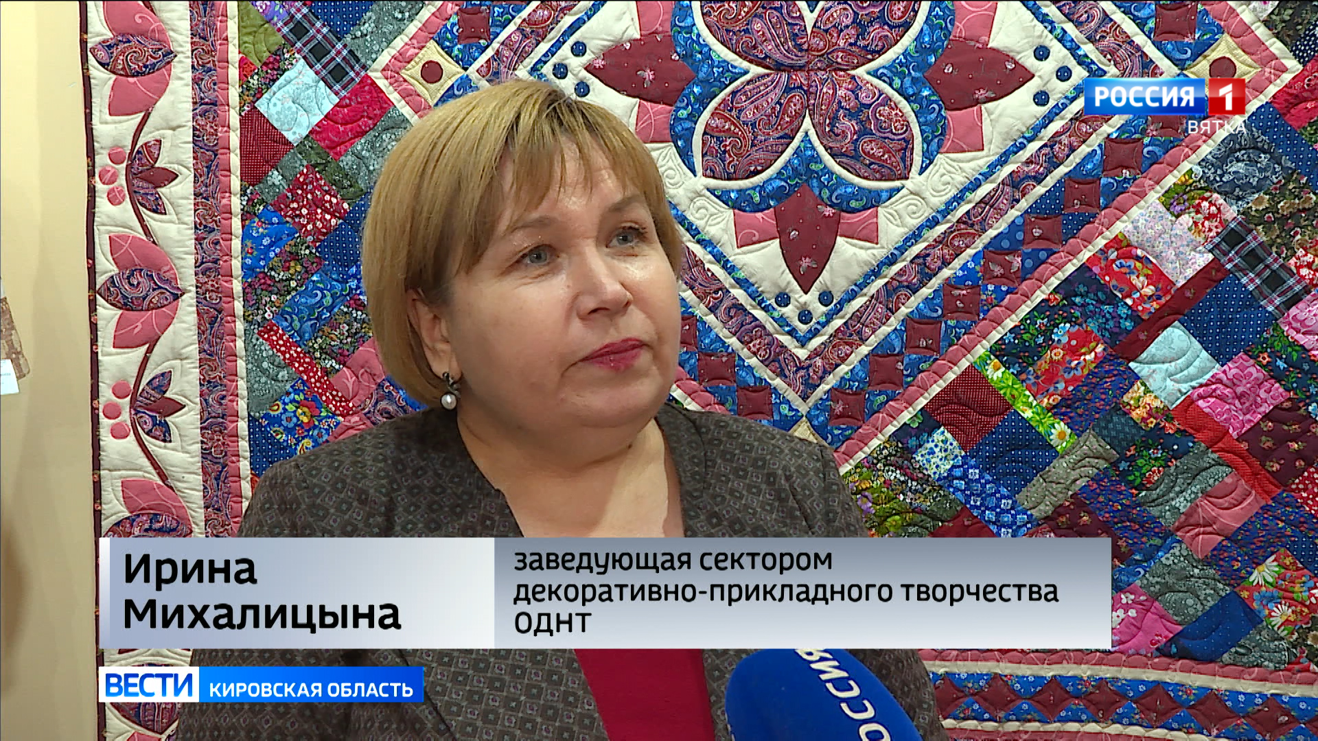 «Работа, которая находится рядом с нами это работа моя и моей помощницы Любы Детятевой из Кирово-Чепецка, особо тонкие действия. Например, вышивку. У нас такие работы в тандеме уже не первый раз. Мне очень нравятся работы в фольклорном стиле и очень нравится использовать ткани, которые давно забыты. Это ситцы, определенные набивки - Барановского комбината. И вот это все здесь присутствует. Это очень дорого сердцу. Поэтому вот такая работа появилась, как юбилейная».