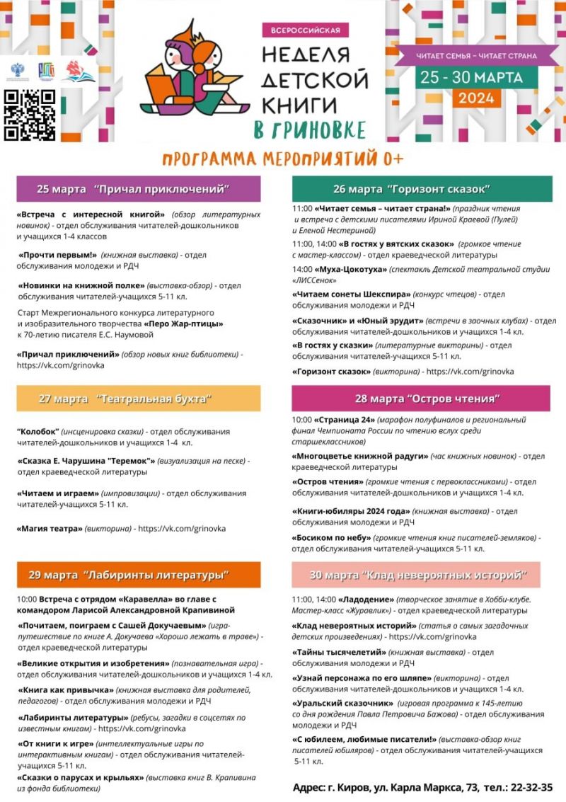 В Гриновке пройдет Неделя детской и юношеской книги. Об этом сообщили в министерстве культуры Кировской области.В этом году серия мероприятий будет посвящена Году семьи. Ребята познакомятся с выставками лучших детских и молодежных произведений, примут участие в литературно-познавательных конкурсах, играх и акциях и проверят свои знания и умения.
