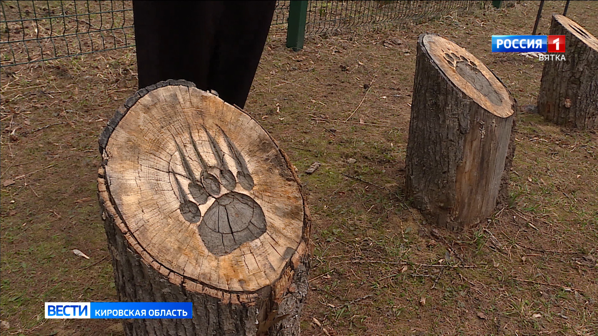 - Сейчас мы приступим к изучению следов, давайте посмотрим, чьи следы изображены на этих двух пеньках? Медведь, правильно.