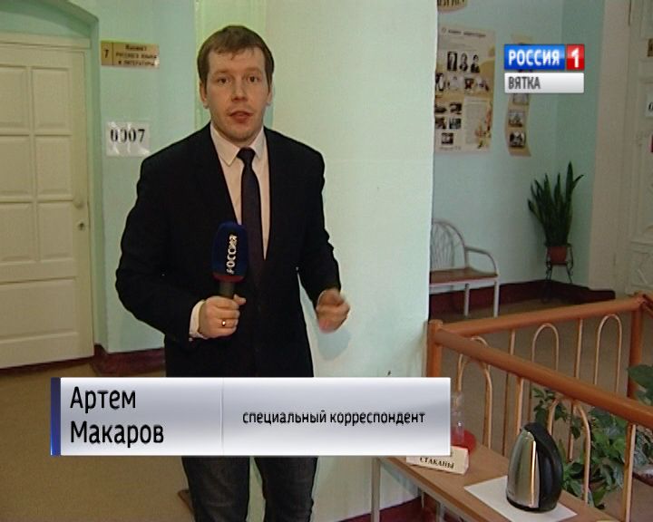 «Во время проведения экзамена выпускник может поднять руку и попроситься выйти, что бы попить воды. Здесь в коридоре для выпускников уже подготовлены чистые стаканы, а так же чайник с водой».