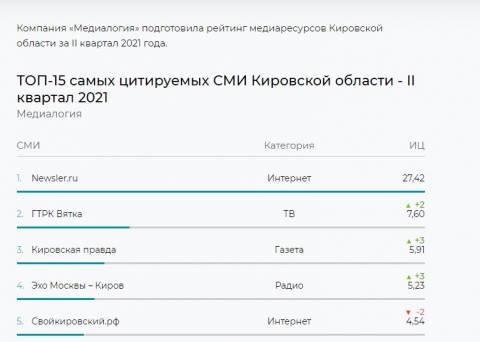 Кроме того, мы поднялись на две строчки вверх по сравнения с итогами I квартала текущего года. Тогда ГТРК «Вятка» занимала четвертое место в рейтинге и также являлась единственным телевизионным СМИ, оказавшимся в ТОП-15.