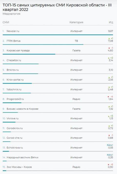 За период трех месяцев (с июля по сентябрь) ГТРК «Вятка» присвоен индекс цитируемости 7,08.
