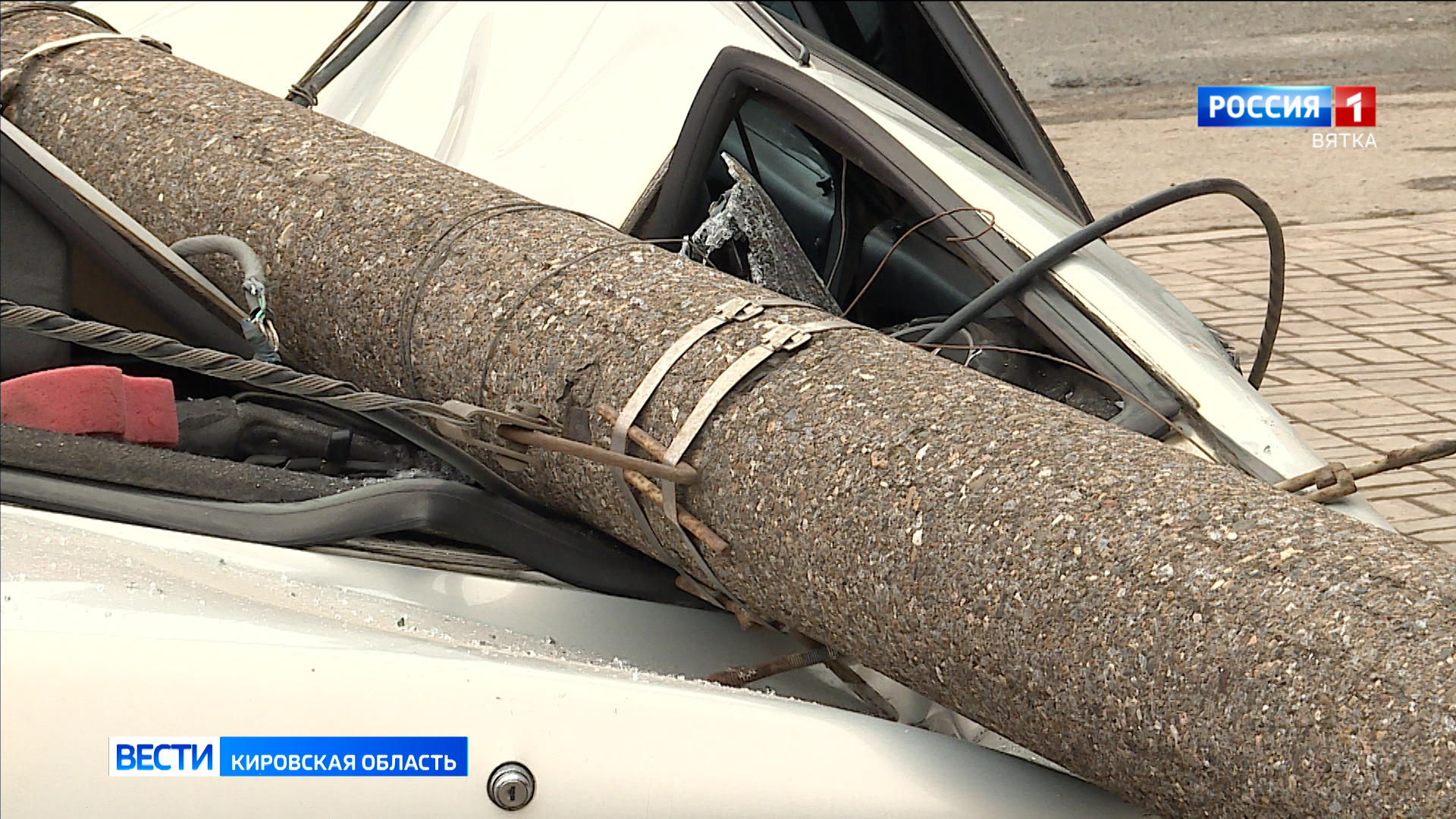 В Кирове на улице Профсоюзной на легковой автомобиль упала опора уличного освещения. В администрации Кирова сообщили, что столб упал в результате ДТП.