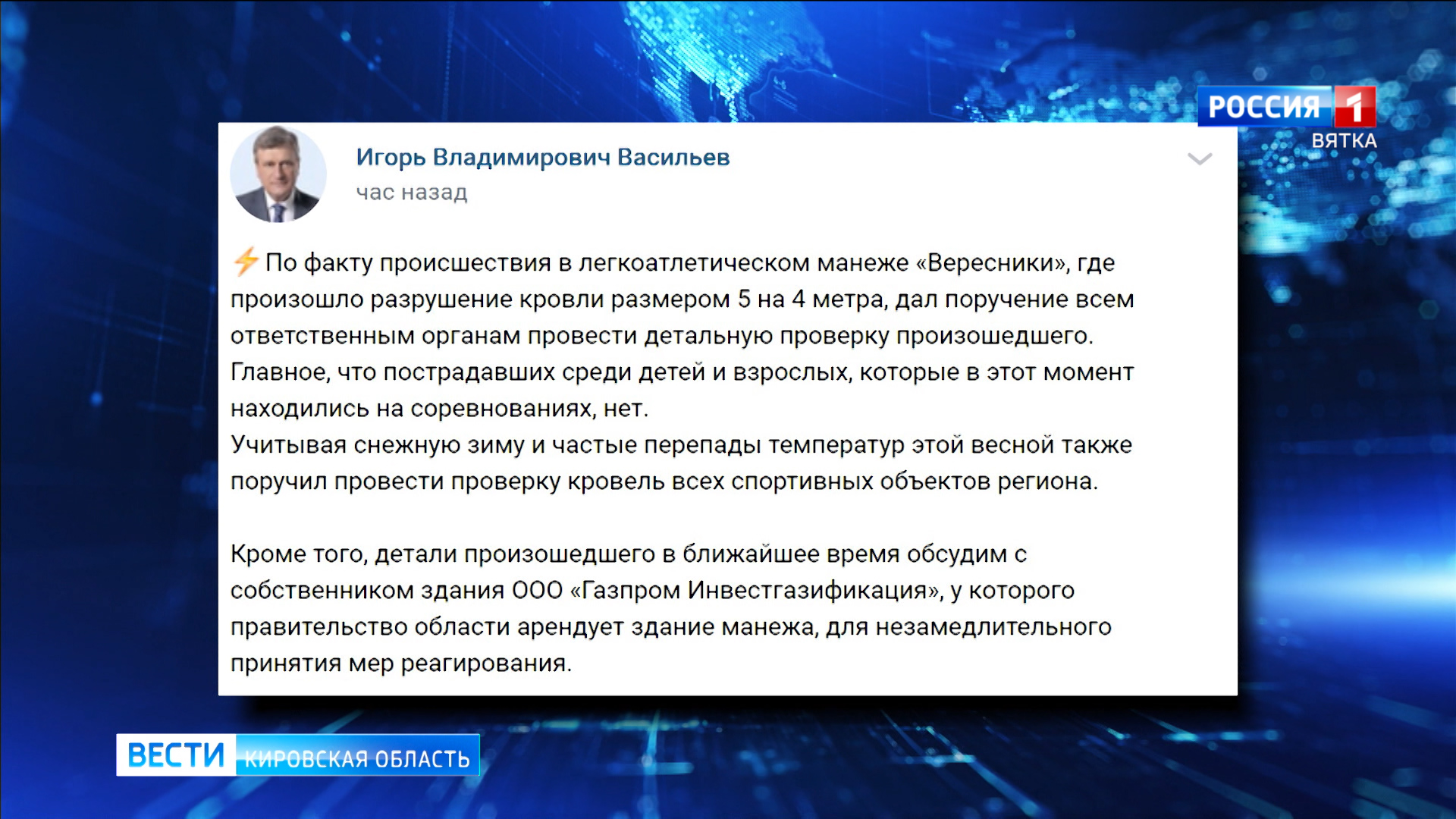 «Произошло частичное разрушение одного сегмента кровли. Точную причину установит комиссия, которая начнет свою работу в регионе уже с завтрашнего дня. Сформирована она собственником объекта, у которого правительство Кировской области арендует здание легкоатлетического манежа».