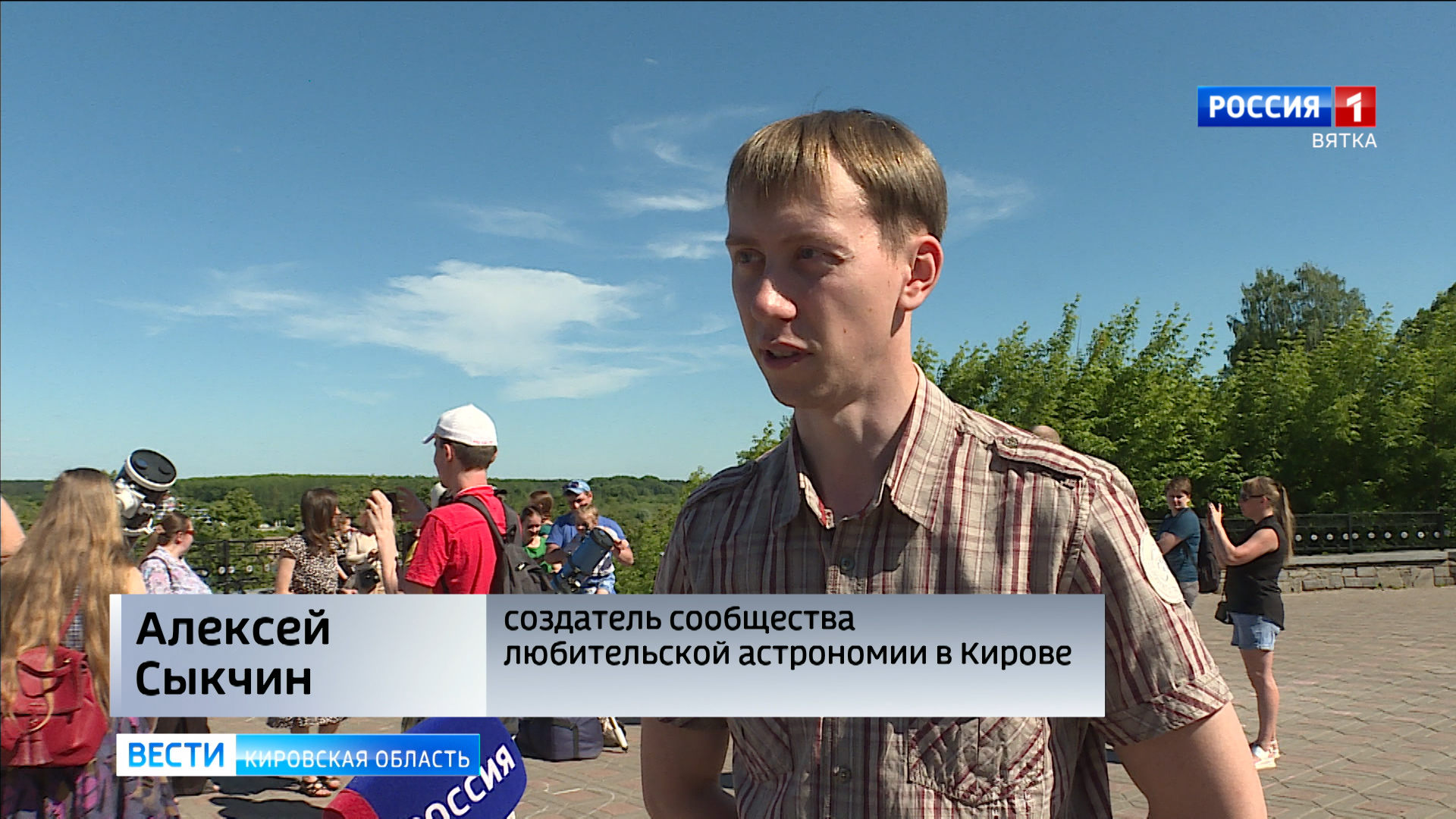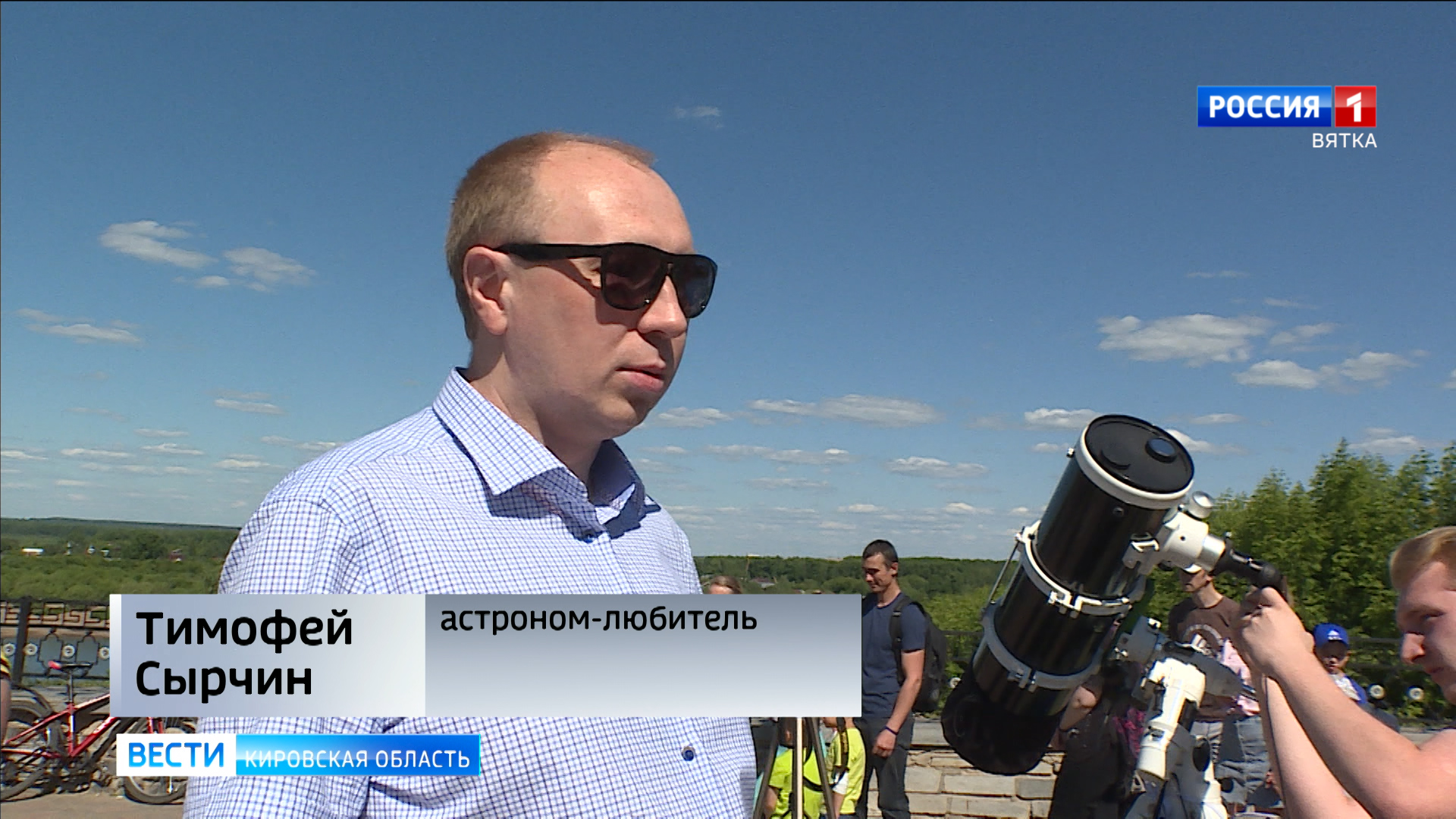 АЛЕКСЕЙ СЫКЧИН, СОЗДАТЕЛЬ СООБЩЕСТВА ЛЮБИТЕЛЬСКОЙ АСТРОНОМИИ В КИРОВЕ:«На наблюдательной площадке представлены два телескопа - оба из них - это телескопы системы "Ньютон", то есть у них в качестве объектива используется вогнутое зеркало, ну, и, конечно же, перед объективом стоит специальная пленка, которая задерживает часть солнечного света, чтобы можно было наблюдать безопасно для зрения».