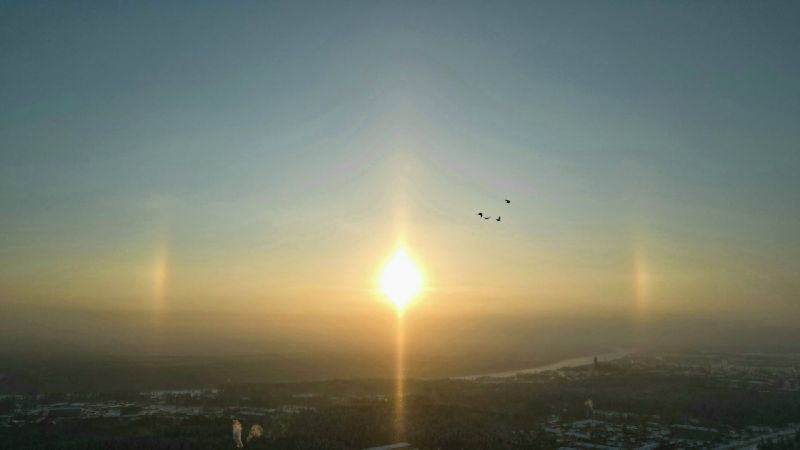 Другой житель Котельнича сфотографировал оптическое явление - солнечное гало, напоминающее ореол вокруг Солнца.Как объяснили специалисты, световой лес - это множество (более одного) световых столбов, которые исходят от искусственных источников света — неоновых вывесок или различных прожекторов. С точки зрения науки — это интереснейшее оптическое атмосферное явление.