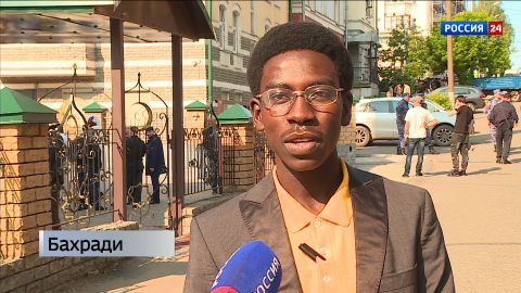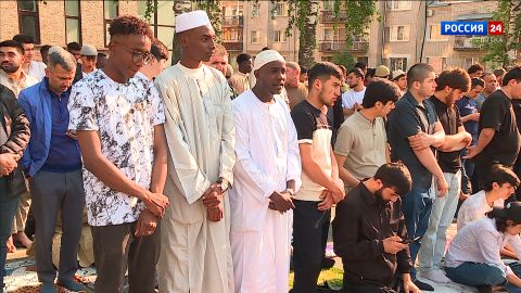 Все желающие помолиться в этот день не могут поместиться в небольшой мечети. Верующие остаются на улице, где для богослужения выделяется отдельное пространство. Сегодня здесь все - и руководители диаспор, и верующие буквально со всего мира.